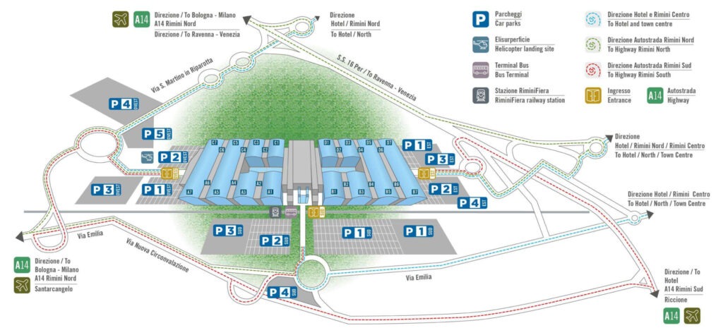 Per raggiungere la Fiera l’uscita autostradale è Rimini Nord. Per maggiori informazioni www.autostrade.it.